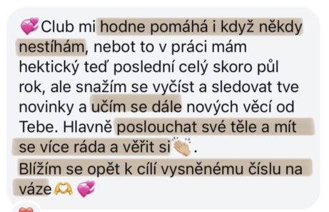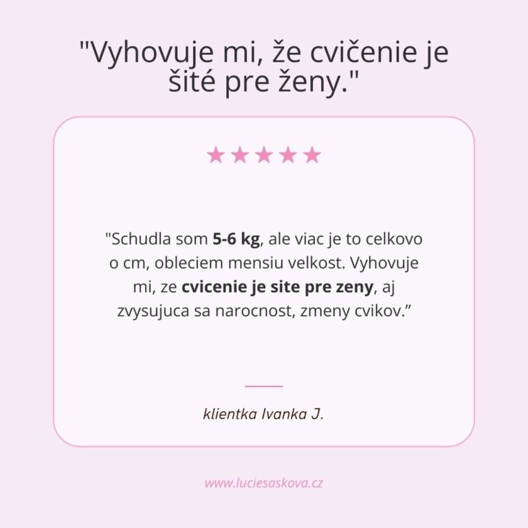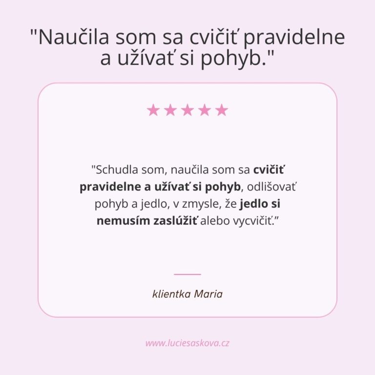 „Je to skvele motivujúci club, kde mám na jednom mieste tréningové plány, recepty aj výzvy. Páči sa mi, že si môžem odškrtávať hotové dni to ma drží v rytme. Lucka je mi veľmi sympatická, má príjemný hlas, skúsenosti a kredibilitu. Cvičím doma, šetrím čas a pritom som nabrala svaly a zlepšila si fyzičku.“