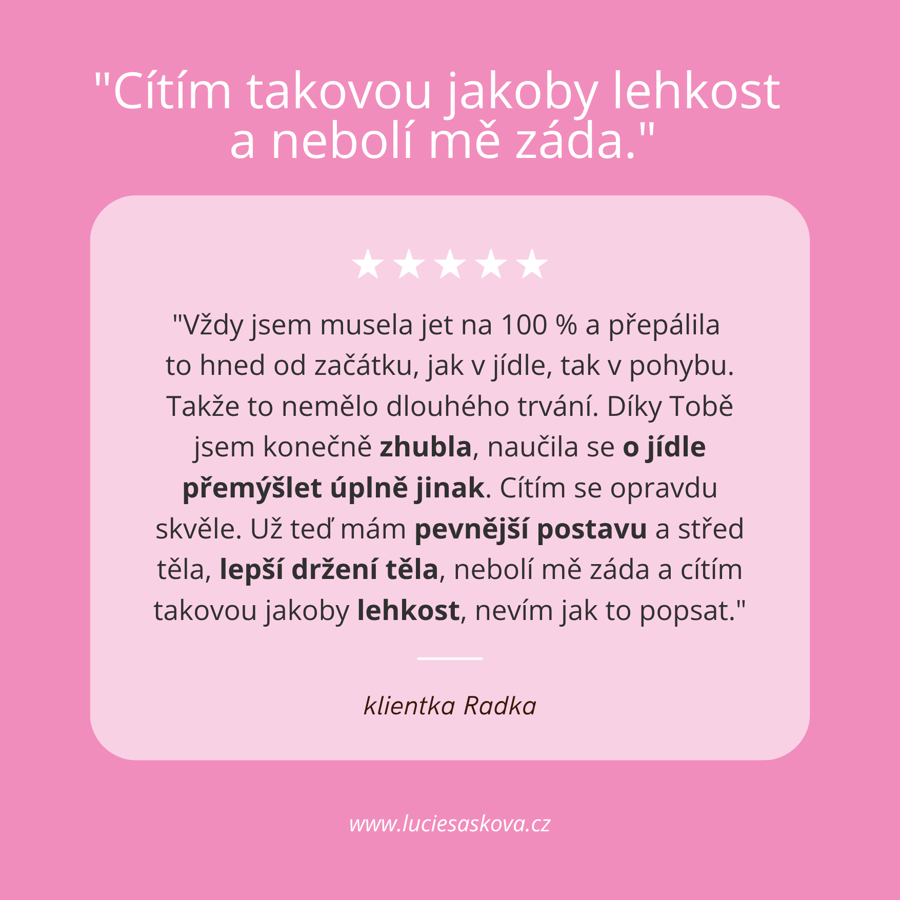 Rozumím. Začátky jsou nejcitlivější období a tlak na dokonalost je častý důvod, proč to spousta žen vzdá. 👉 Club je vytvořený tak, aby tě podržel od prvního dne. Lekce jsou vedené krok za krokem, ukazuji i lehčí varianty, vysvětluji techniku a zároveň ti pomůžu budovat návyky i v mindsetu, výživě a self-care. Nemusíš být dokonalá. Stačí začít tam, kde jsi.