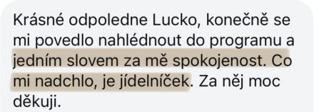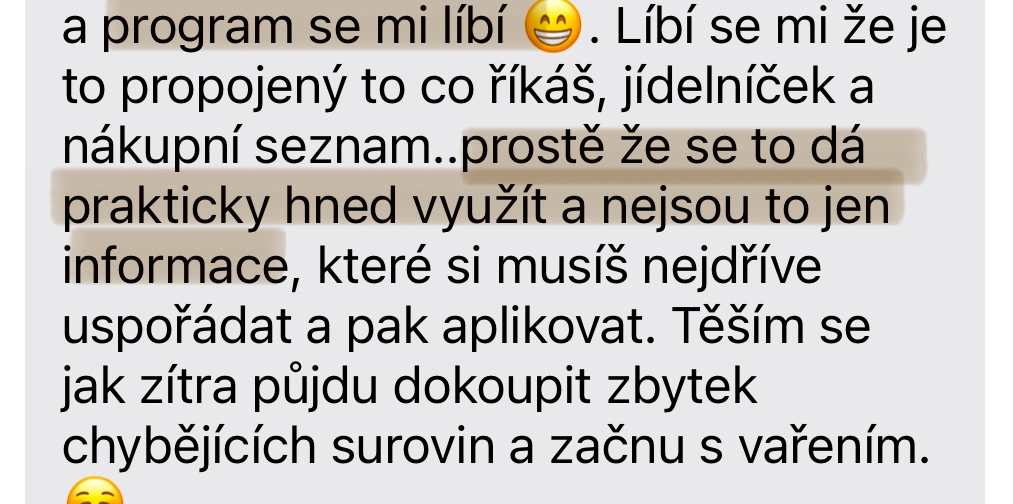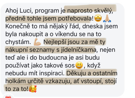 Program se mi líbí! Dá se to prakticky hned využít. Líbí se mi, že je propojený to, co Lucka říká, jídelníček a nákupní seznam. Nejsou to jen informace, které si musí člověk nejdříve uspořádat a pak aplikovat, ale může rovnou začít.