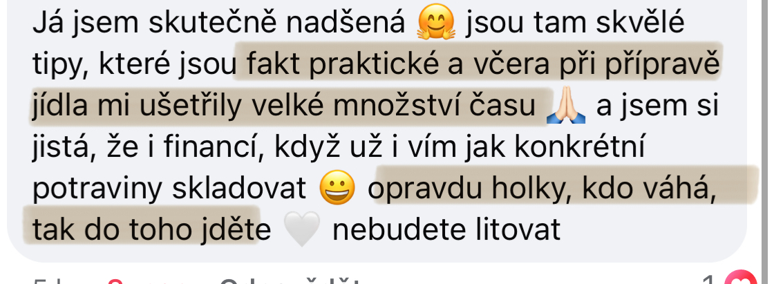 Jsem nadšená! Jsou tam skvělé tipy, které jsou fakt praktické a včera při přípravě jídla mi ušetřily velké množství času a jsem si jistá i financí, když už i vím, jak konkrétní potraviny skladovat. Kdo váhá, jděte do toho, nebudete litovat.