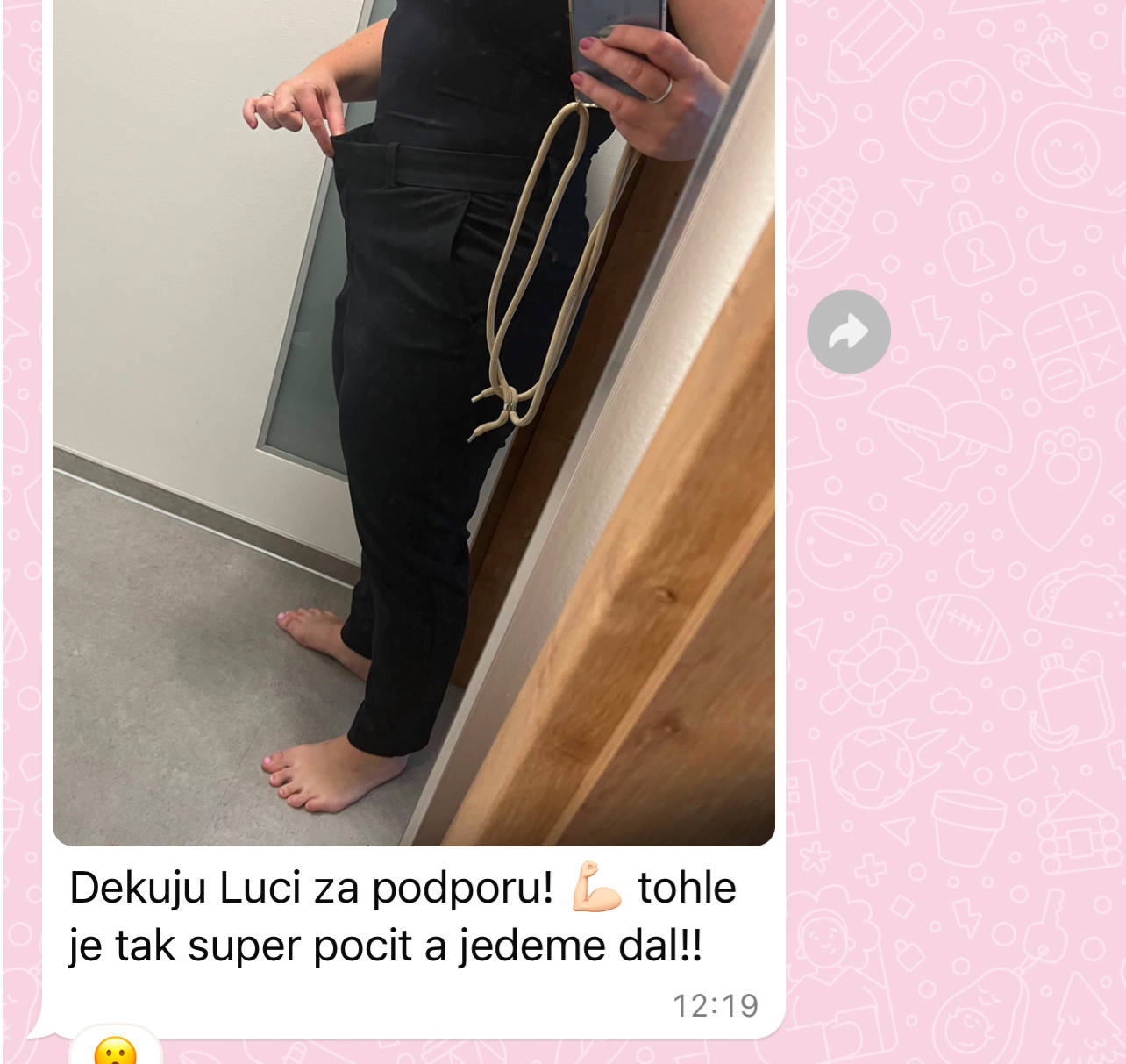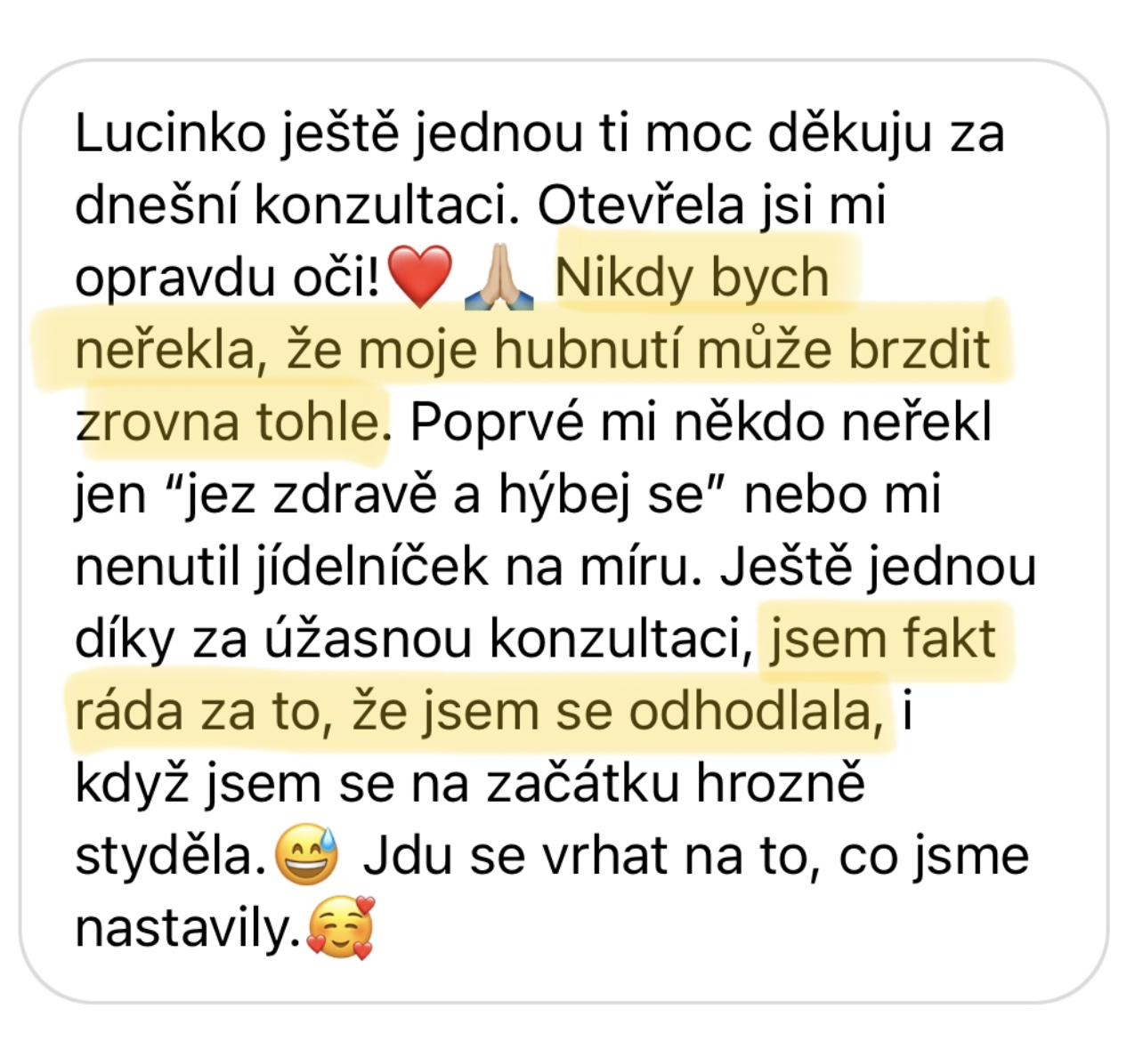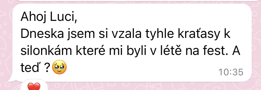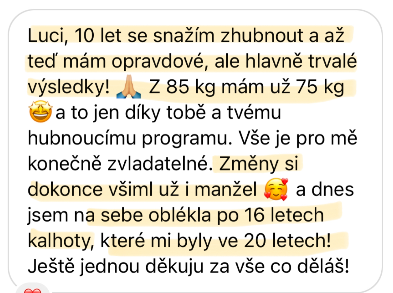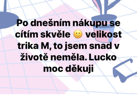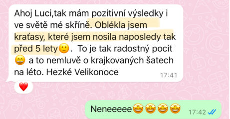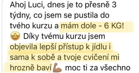 "Dříve bych nevěřila, že dokážu trvale zhubnout 30 kg. Už před dětma jsem bloudila v cyklu diet a různých výzev na internetu. Nikdy to pro mě nebylo ale udržitelné, takže jsem stále čelila jojo efektům. Myslela jsem si, že zdravý životní styl odráží tyhle diety a jí takhle všichni, co mají super postavu a které jsem obdivovala. Časem jsem si vybudovala špatný postoj k jídlu i závislost na jídle a dlouho jsem s tím bojovala. Až s Luckou se mi podařilo to odbourat a zhubnout. Vybudovala jsem si konečně zdravý vztah k jídlu a cítím se zase sebevědomě, což mi po porodu dělalo velký problém. Luci, moc ti za všechno děkuju!"
