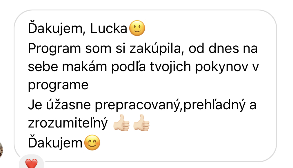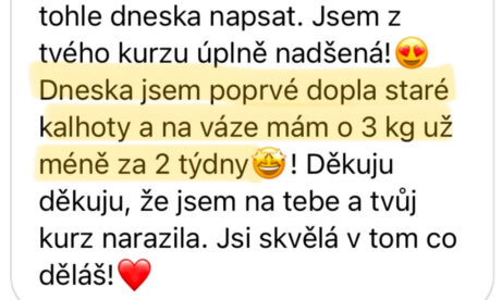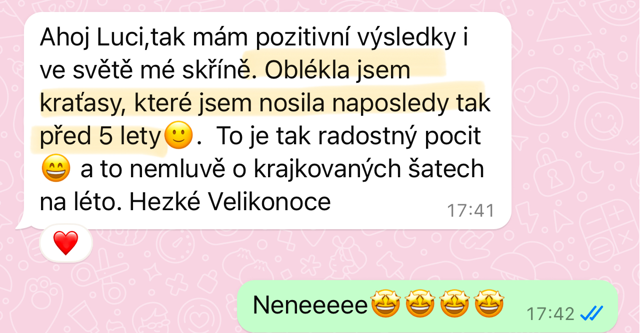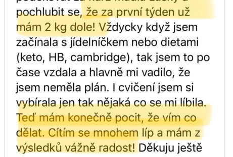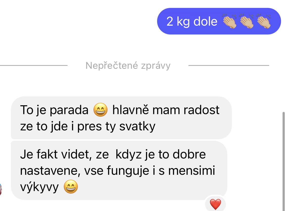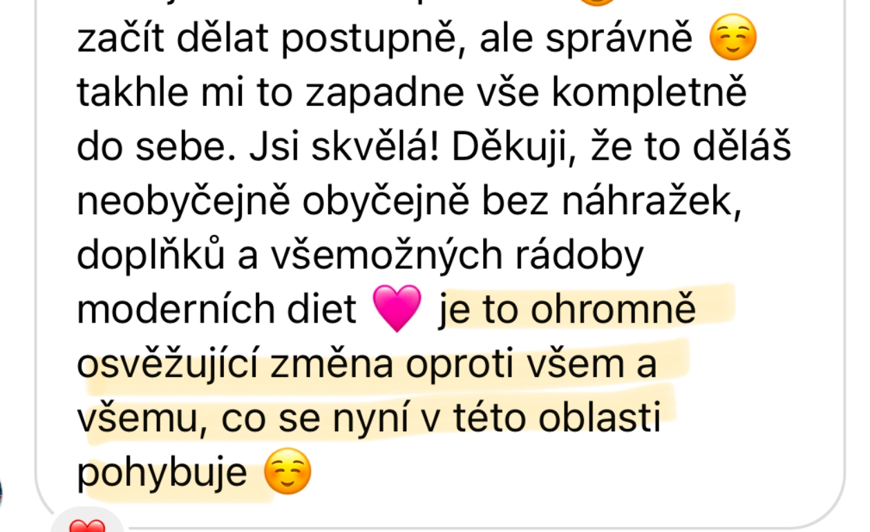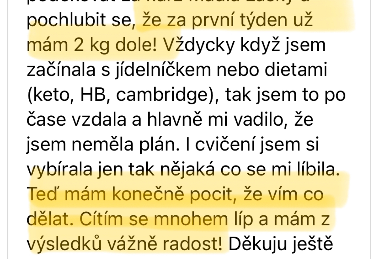 - VEDENÍ A PRAVIDELNÁ ZPĚTNÁ VAZBANebudeš na to sama. Po každém týdnu mi odevzdáš krátký report nejen s výsledky hubnutí, ale také s tím, co se ti povedlo a co tě naopak zaskočilo. Já se na to mrknu, dám ti soukromě emailem individuální zpětnou vazbu a ukážu, kudy se posunout dál. Nemusíš se bát, že tě to časově přeroste – program je postavený pro vytížené ženy, které mají rodinu, práci, zájmy… a přesto chtějí udržitelně hubnout a konečně vidět výsledky, které vydrží.
